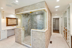 Gourmet country kitchen with modern appliances, woodgrain finishes, and patterned tile entry